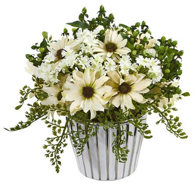 10" Mixed Daisy Artificial Arrangement in White Vase Silver Trimming