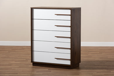 Baxton Studio Mette Mid-Century Modern Two-Tone White and Walnut Finished 5-Drawer Wood Chest