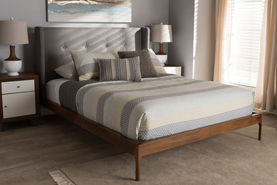 Baxton Studio Brooklyn Mid-Century Modern Walnut Wood Grey Fabric Queen Size Platform Bed
