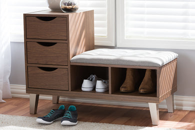 Baxton Studio Arielle Modern and Contemporary Walnut Wood 3-Drawer Shoe Storage Grey Fabric Upholstered Seating Bench with Two Open Shelves