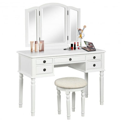 Tri-Fold Mirror Table Stool Wooden Vanity Make Up Dressing Set-White