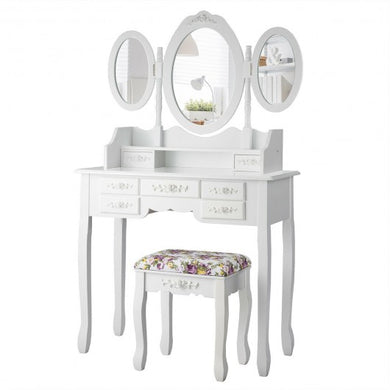 7 Drawer Tri-Folding Mirror Dressing Vanity Makeup Set-White
