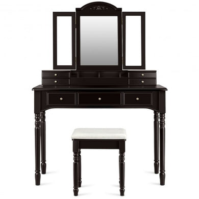 Tri Folding Mirror Vanity Table Stool Set with 4 Drawers-Black