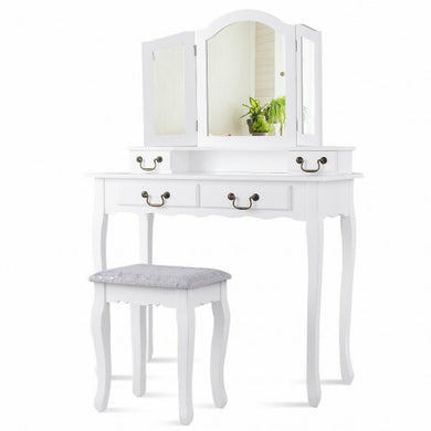 Tri Folding Mirror Vanity Table Stool Set w/ 4 Drawers and Cushioned Stool-White