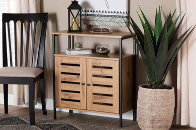 Baxton Studio Yuna Mid-Century Modern Transitional Natural Brown Finished Wood and Black Metal 2-Door Storage Cabinet
