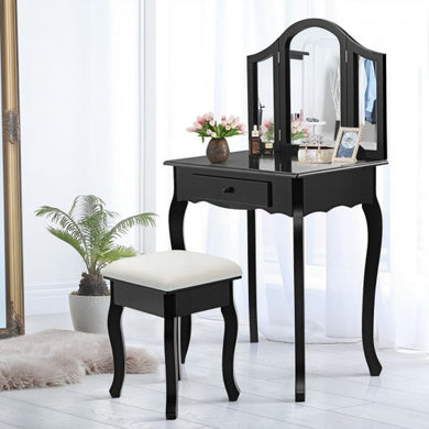Vanity Makeup Dressing Table Set with Tri-Folding Mirror and Drawer-Black