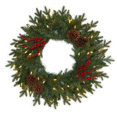 • 24" Green Pine Artificial Christmas Wreath with 50 Warm White LED Lights, Berries and Pine Cones
