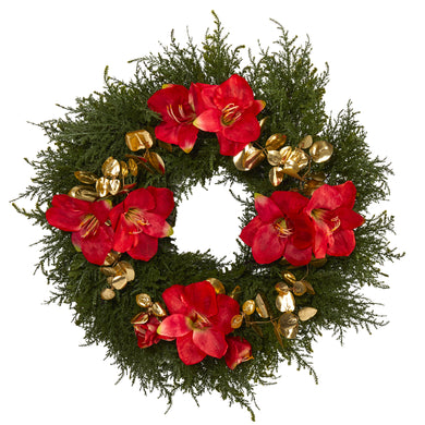 • 24" Cedar, Amaryllis and Metallic Eucalyptus Artificial Wreath