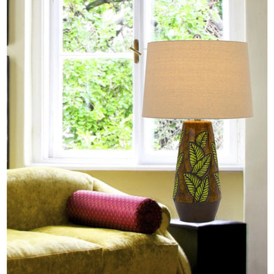 150W 3 way Morrilton glass table lamp with wood pole and hardback taper drum fabric shade, Glass/Light Oak
