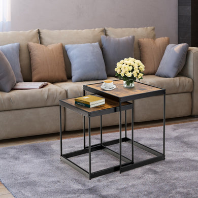 • Set of 2 Modern Nesting Tables with Sturdy Steel Frame for Living Room-Rustic Brown