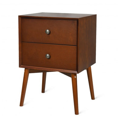 • Nightstand Mid-Century End Side Table with 2 Drawers and Rubber Wood Legs-Brown