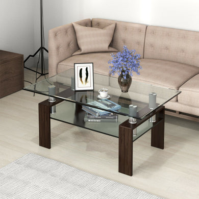• Rectangular Tempered Glass Coffee Table with Shelf-Brown