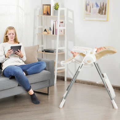 Foldable Baby High Chair with Double Removable Trays and Book Holder-Beige