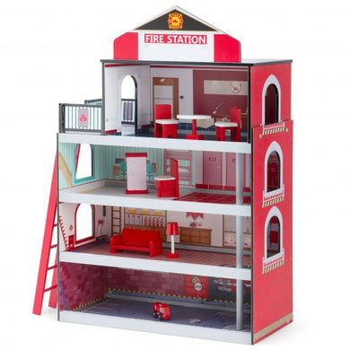 Wooden Fire Station Dollhouse Playset with Truck and Helicopter