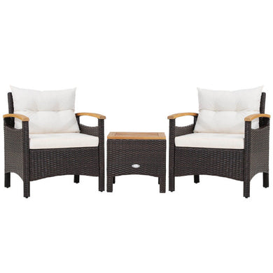 3 Pieces Patio Rattan Furniture Set with Acacia Wood Tabletop-White
