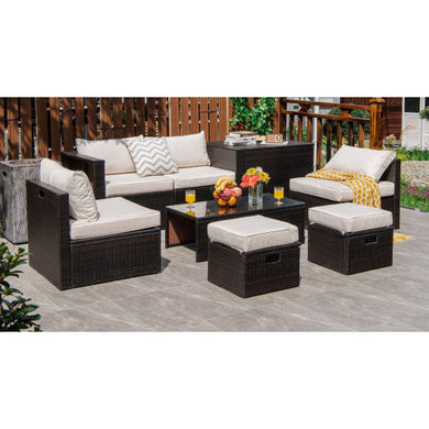 8 Pieces Patio Space-Saving Rattan Furniture Set with Storage Box and Waterproof Cover-White