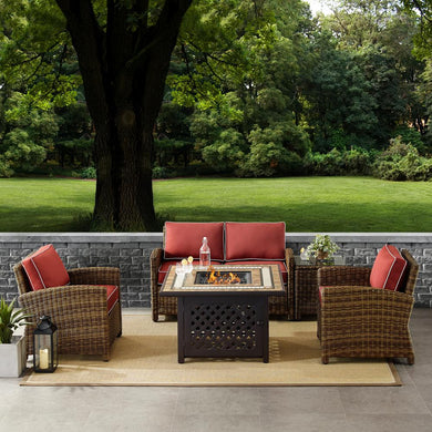 Bradenton 5Pc Outdoor Wicker Sofa Set W/Fire Table Weathered Brown/Sangria - Sofa, Side Table, Tucson Fire Table, & 2 Armchairs