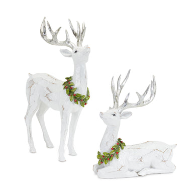 White Deer Figurine with Silver Antler and Wreath Accent (Set of 2)