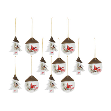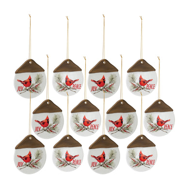 Ceramic Cardinal Pine Branch Peace Joy Tag Ornament (Set of 12)