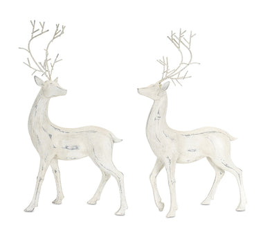 Distressed Ivory Deer Figurine with Metal Antlers (Set of 2)