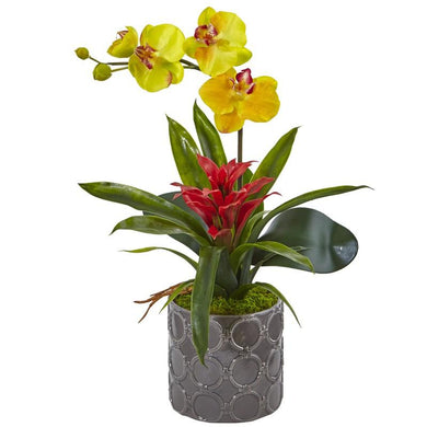 Mini Phalaenopsis Orchid and Bromeliad in Gray Vase
