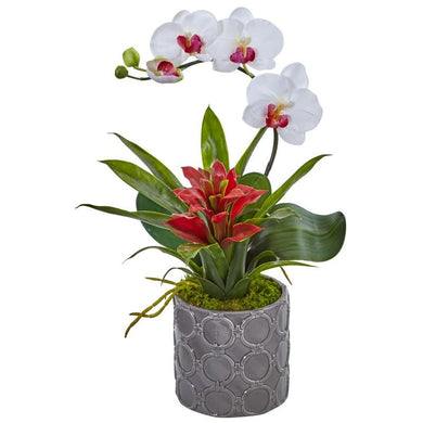 Mini Phalaenopsis Orchid and Bromeliad in Gray Vase