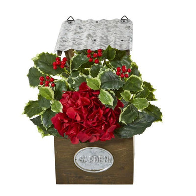 14" Hydrangea and Holly Leaf Artificial Arrangement in Tin Roof Planter