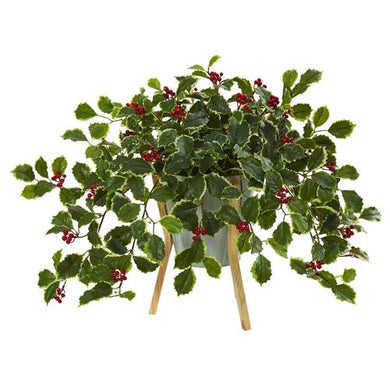 22" Variegated Holly Berry Artificial Plant in Green Planter with Stand (Real Touch)