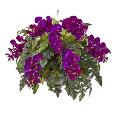 25" Phalaenopsis Orchid and Holly Fern Artificial Plant in Metal Hanging Bowl