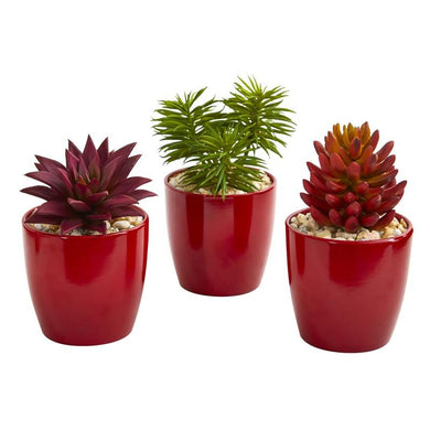 8" Mixed Succulent Artificial Plant in Red Vase (Set of 3)