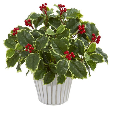 15" Variegated Holly Leaf Artificial Plant in Vase (Real Touch)