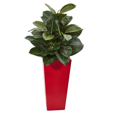 37" Artificial Rubber Plant In Red Tower Planter 9246 By Nearly Natural