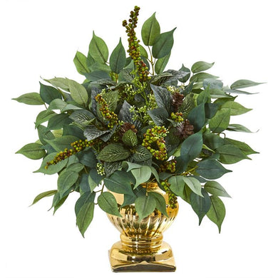 15" Royal Ficus and Fittonia Artificial Plant in Gold Urn