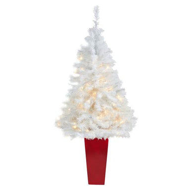 4.5' White Artificial Christmas Tree with 100 Clear LED Lights in Red Planter