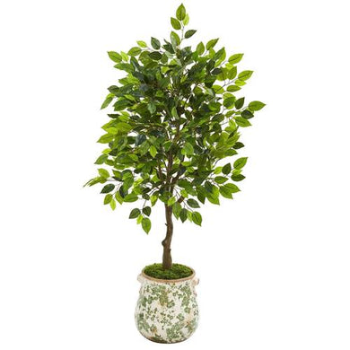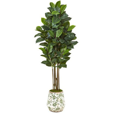 63" Rubber Leaf Artificial Tree in Floral Print Planter