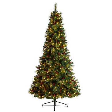 8'Flat Back Montreal Mountain Pine Artificial Christmas Tree with Pinecones, Berries and 300 Warm White LED Lights and 767 Bendable Branches
