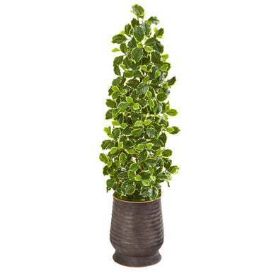 43" Variegated Holly Leaf Artificial Tree in Ribbed Metal Planter (Real Touch)