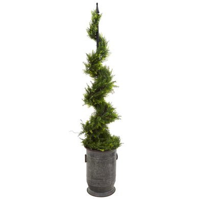 58" Cypress Artificial Spiral Topiary Tree in Vintage Metal Planter