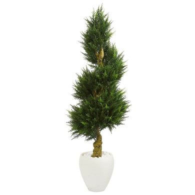 5' Cypress Spiral Artificial Tree in White Oval Planter UV Resistant