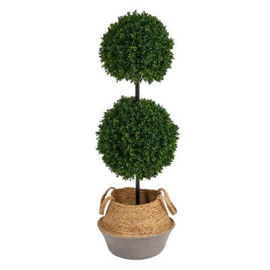 3.5'Boxwood Double Ball Artificial Topiary Tree in Boho Chic Handmade Cotton & Jute Gray Woven Planter UV Resistant (Indoor/Outdoor)