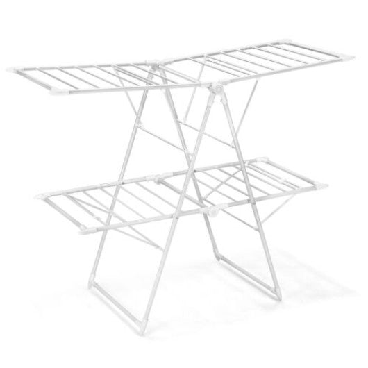 2-Level Foldable Clothes Drying Rack with Height-Adjustable Gullwings-White
