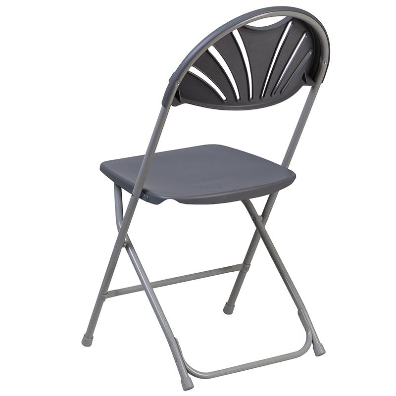 Imagine getting to setup these gorgeous fan back plastic folding chairs outside your venue where wedding ceremonies are held on sunny days as guests sit excitedly awaiting the arrival of the bride. Plastic folding chairs offer an easy seating solution for formal and informal events. Plan high tea, weddings, baby showers, and social events for clients. Folding chairs are more than ideal for the home to accommodate additional people during dinner parties, holidays, game nights, barbecues and book clubs. Their foldable design allows you to store them in your hall closet, garage or underneath furniture if you're tight on space. With an 18-gauge steel frame built to hold up to 650 pounds you'll have no problem seating all guests. Although designed for indoor use these foldable chairs have drain holes in the seat to prevent water from pooling during outdoor affairs and the textured seating surface is easy to clean after the most hectic events. Have your facilities manager stock plenty of these popular party chairs. After events these folding chairs stack on top of each other for compact storage, pair with a dolly to transfer between locations or keep them stored on the dolly.