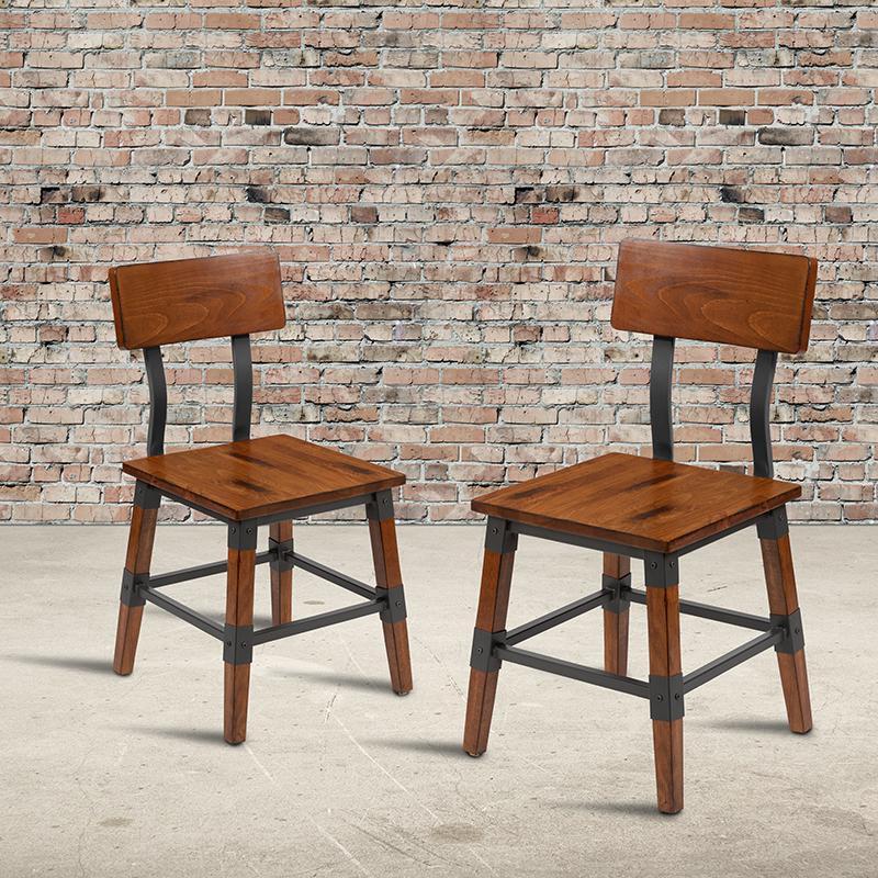 Create a modern, on-trend industrial look when furnishing your establishment with this set of 2 richly hued wood dining chairs. The marriage of wood and metal blends seamlessly giving this wooden dining chair an up to date appearance that will make an attractive addition to your restaurant, lounge, bar or other high traffic venues. This solid beechwood dining chair has an easy to clean walnut finish, which is an important aspect when it comes to a business. Although designed to withstand the daily rigors in the hospitality industry, this versatile chair will also provide a warm and inviting quality to your home. Use the wasted space in the your room by tucking this piece in corners as an accent chair or as extra seating for guests in living room, dining room or kitchen. The durable wood frame is stabilized with a support bar for a worry-free seating experience. This chair ships fully assembled for quick and easy setup. Plastic floor glides help protect your floors and ensure smooth gliding. The simple style of this restaurant chair will highlight any space in your home or business.