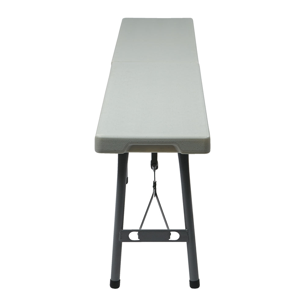 6' Fold in Half Bench. Durable Construction. Light Weight Sleek Design. Powder Coated Tubular Frame. Ideal for Indoor or Outdoor Use. Meets or Exceeds Test Standards (BIFMA and MTL)