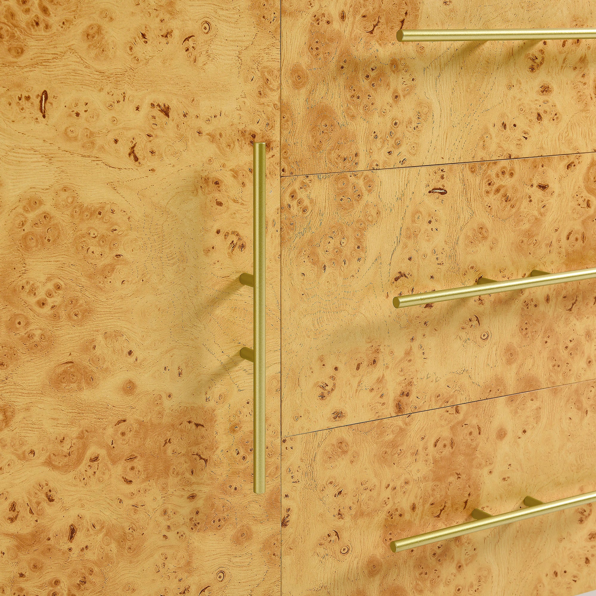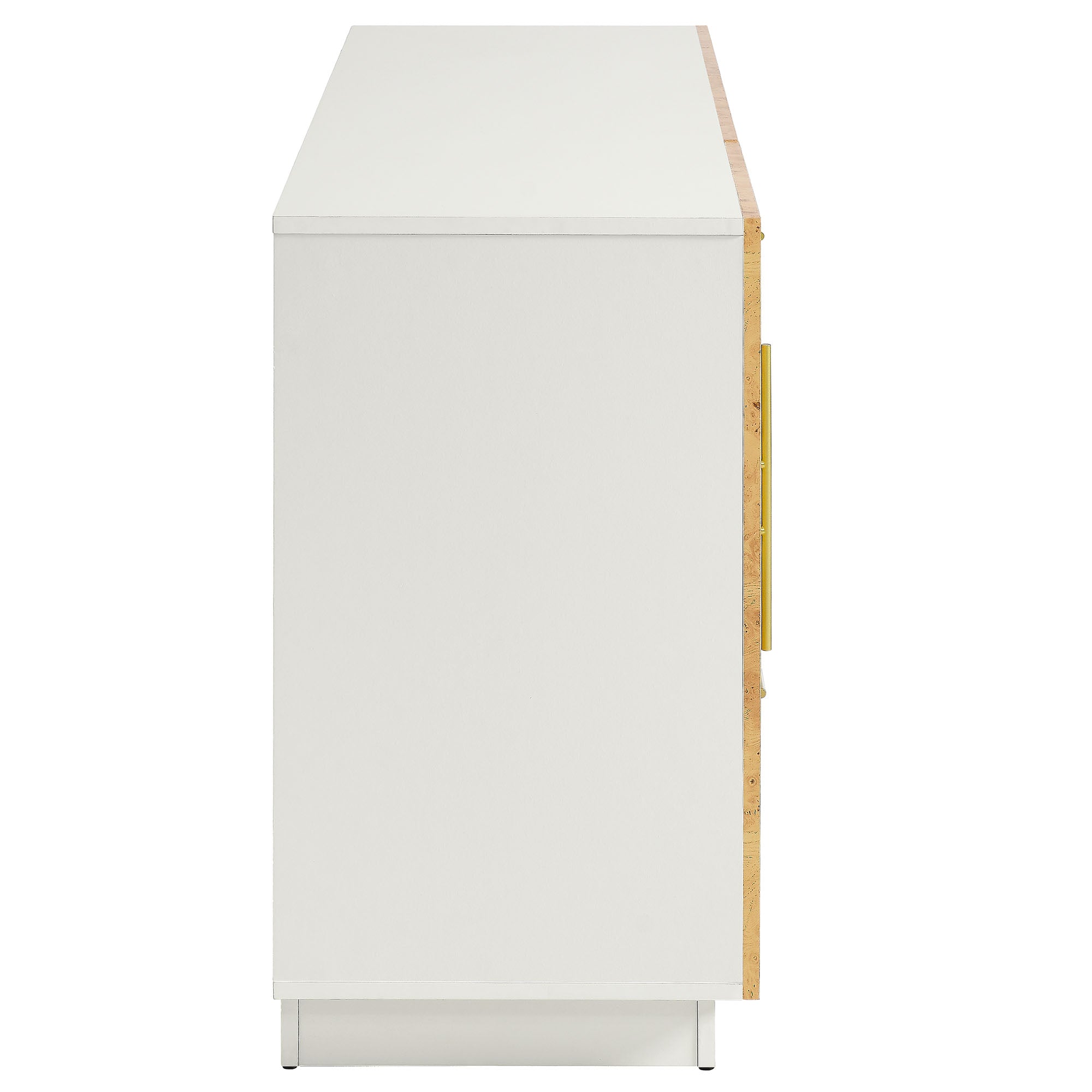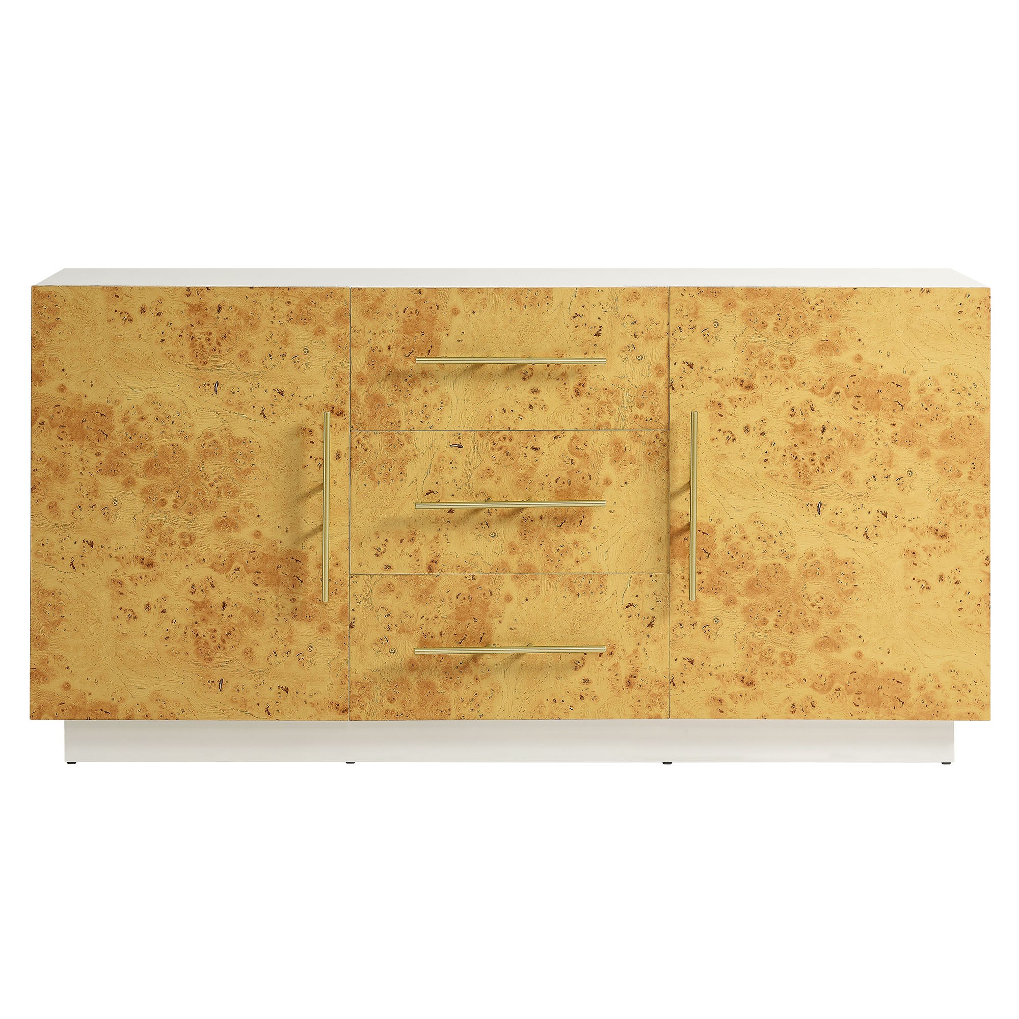 Add a stylish 59 inch storage cabinet to your living room with the eye-catching Abel Burl Wood Sideboard. A perfect blend of mid-century modern design and practical storage, this sideboard cabinet with doors and drawers is crafted from durable particleboard and MDF. Featuring beautifully textured burl wood laminate on its door and drawer fronts, along with elegant gold-tone metal pulls, this sideboard buffet complements both modern and farmhouse-inspired interiors. With soft-close hinges, the two doors and three drawers of the Abel Cabinet Sideboard each open to reveal individual storage compartments, providing stylish storage - whether used in the living room as an entertainment cabinet for anchored or wall-mounted TVs, or as a sideboard buffet cabinet in your dining room. While its burl wood laminate adds a timeless, contemporary design, the spacious compartments of this wood credenza cabinet with drawers ensure your living room essentials are always within reach. Assembly required. Weight Capacity: 287 lbs. One - Abel Sideboard Buffet TV Stand