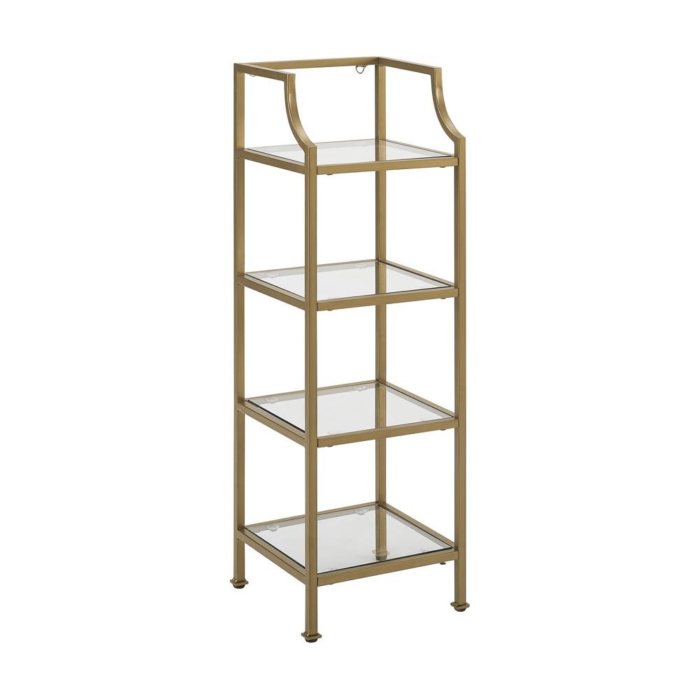 Stylish and modern, the Aimee Short ƒtag�re is an eye-catching addition to a bathroom or home office. With a sturdy yet sleek steel frame, this etagere can store bath items like towels and toiletries, or books and decor for a home office. The open tempered glass shelves of the Žtag�re offer organization without overwhelming the room.