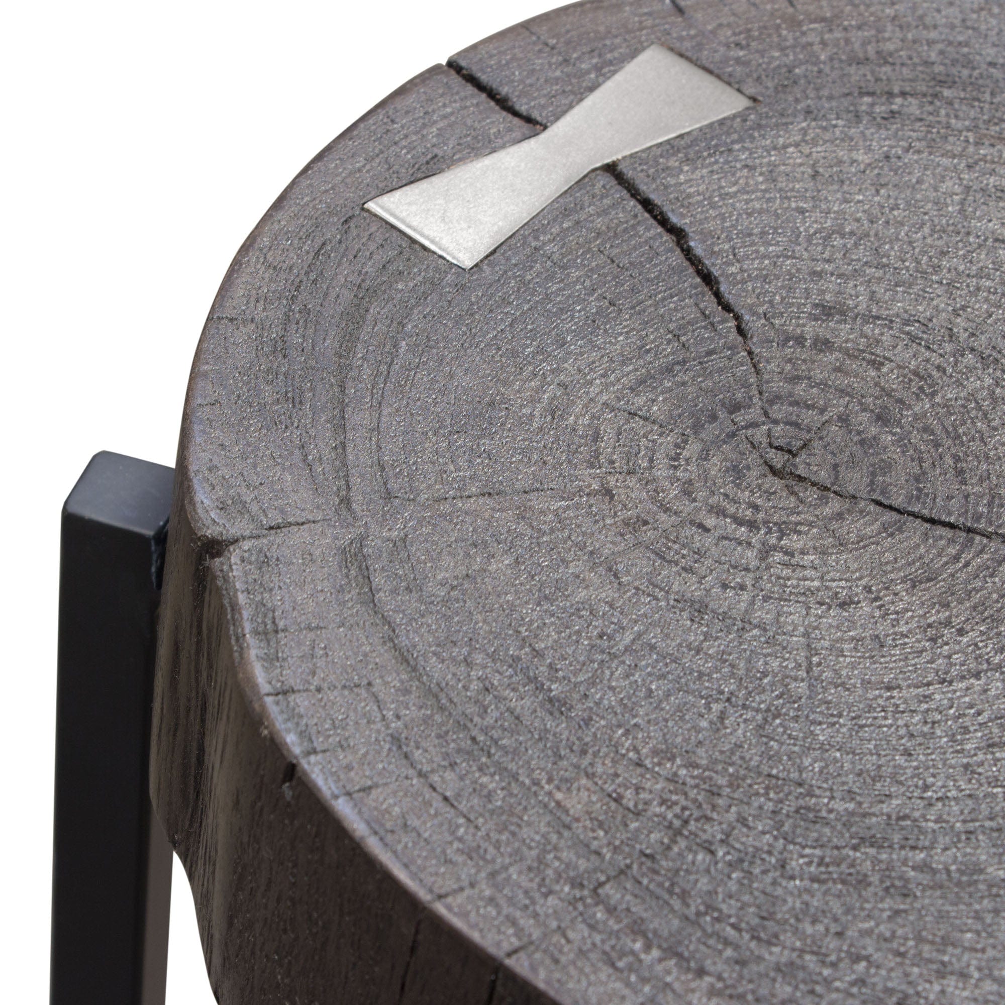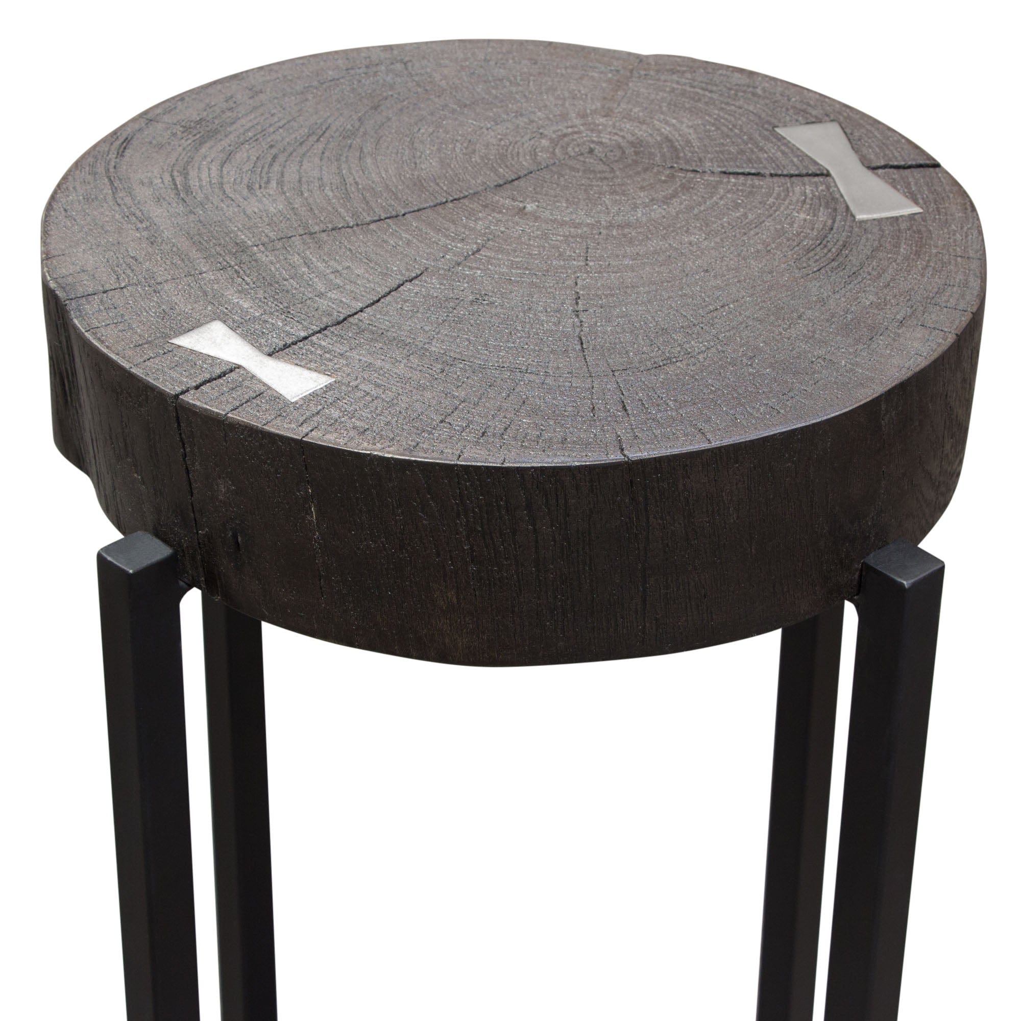 The Alex Large Accent Table features a round Solid Mango Wood Top in Espresso finish w/ Silver Metal Inlay accent detail atop an Iron criss-cross base. Simplistic in Design, Stunning in Detail, the Alex accent tables are the perfect addition to any room's decor. Can be used in tandem or featured independently, they are ideal for contemporary or modern interiors, but also a wonderful table for industrial or loft environments. Table is 12" x 12" x 25".