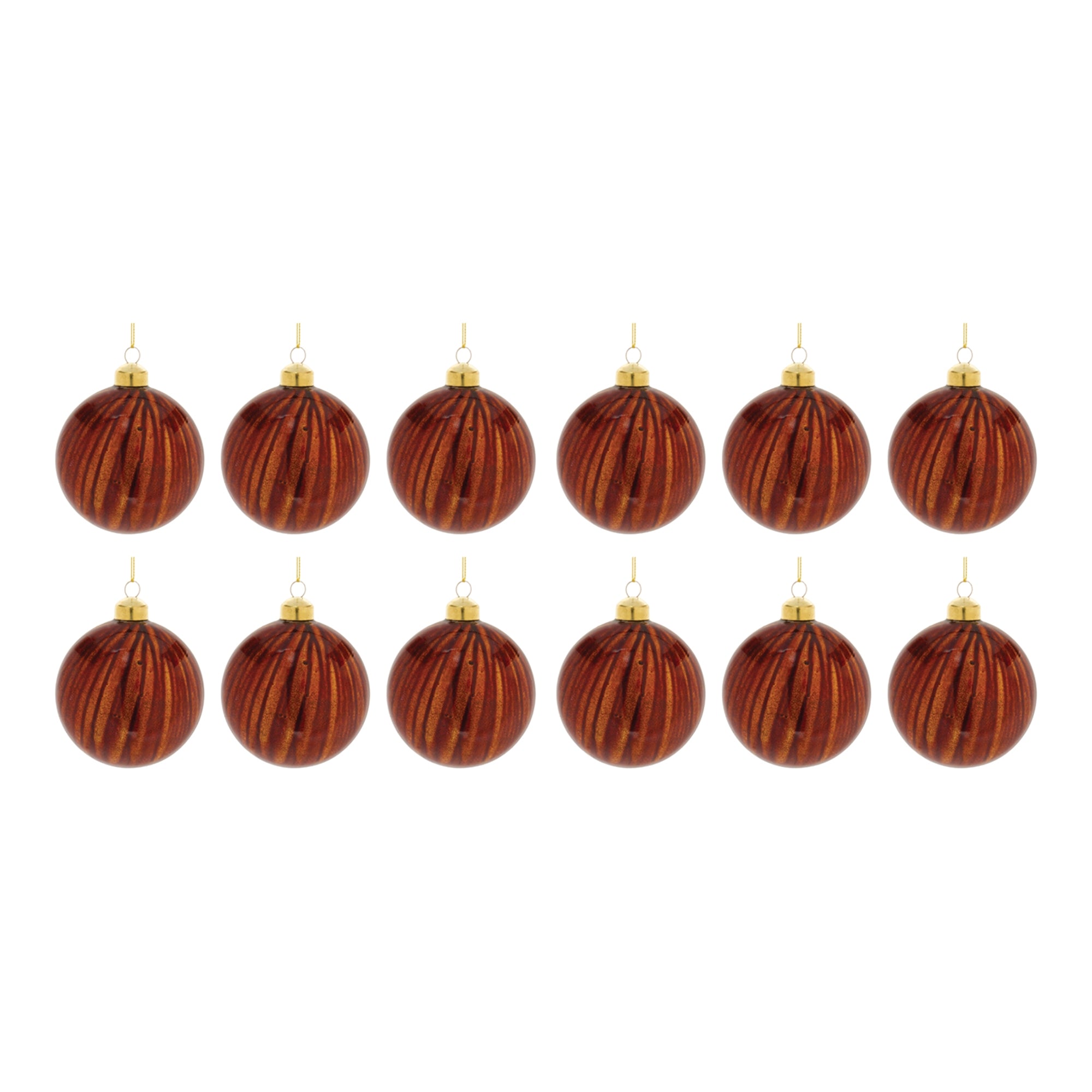 Adorn your Christmas tree and holiday decor with this stunning set of Amber Glass Ball Ornaments. Featuring 12 pieces, the unique root beer tones paired with the painted design is the perfect combination to create a memorable display. The quality glass composition and delicate gold string hanging accent is sure to endure for seasons to come. Whether you're adding a touch of cheer to your home or gifting to a loved one, these ornaments will definitely bring smiles. , Ball Ornament (Set of 12) 3"D Glass