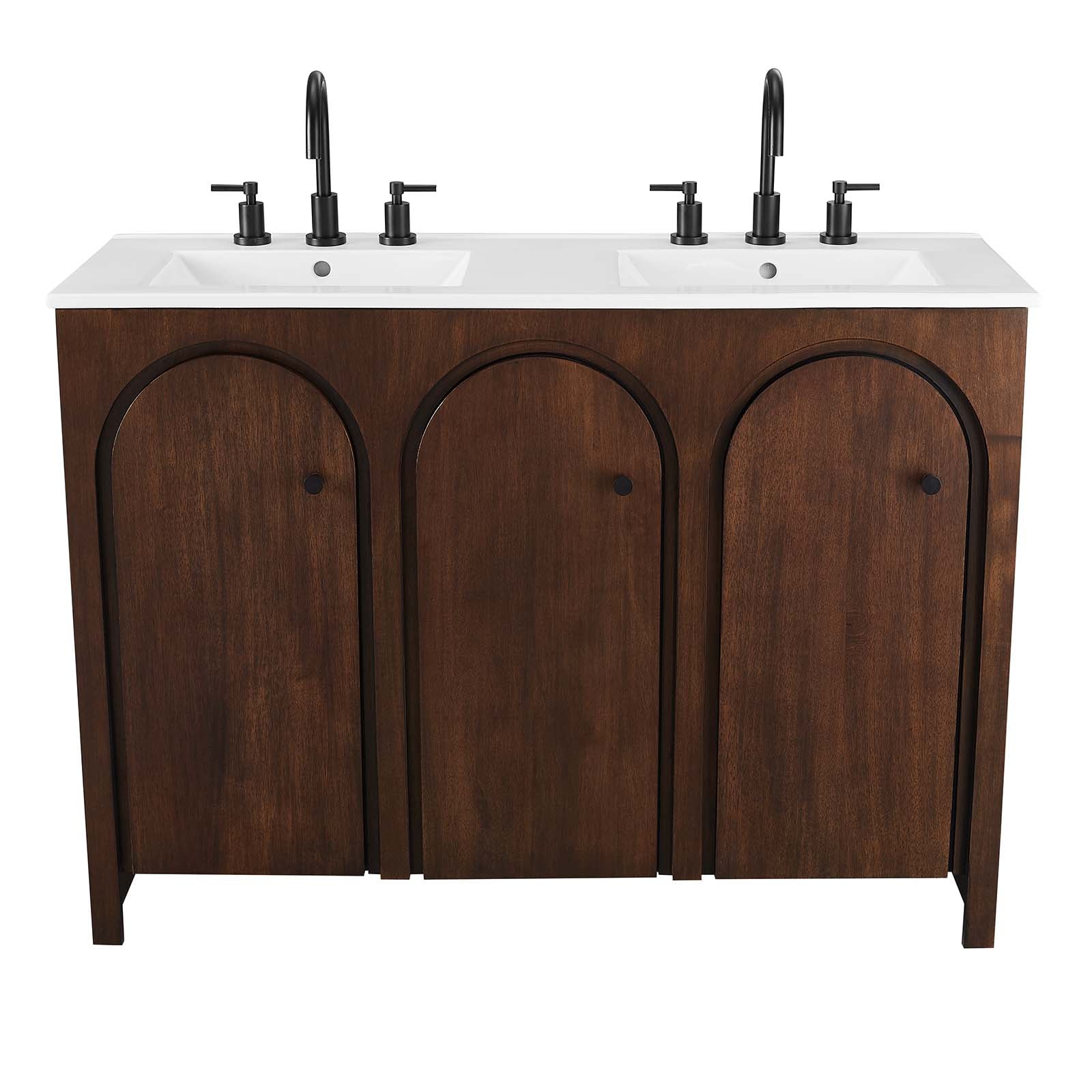 Elevate your bathroom's style with the Appia 48Ó Double Bathroom Vanity Cabinet, where retro elegance meets functionality. Expertly crafted from high-quality MDF and adorned with a mango wood veneer, this vanity cabinet brings stunning organic aesthetics to your bathroom furniture collection. Its three arched doors add beautiful dimension to any primary or guest bathroom. Featuring soft-close hinges, the Appia two sink vanity offers a smooth, quiet experience and includes adjustable shelves with convenient plumbing cut-outs, providing ample storage for all your vanity bathroom essentials. With its white double ceramic sink basin with 8" centerset holes and integrated countertop, this double sink vanity is a great choice for couples, and easily becomes a functional centerpiece in any bathroom. Assembly is straightforward, ensuring you can enjoy this stylish and modern vanity effortlessly. Includes adjustable non-marking foot pads to protect flooring. Fixtures not included. Set Includes: One - Appia 48" Bathroom Vanity Cabinet (Sink Basin Not Included) One - Cayman 48" Double Basin Bathroom Sink