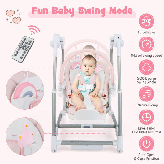 -Designed with 8 adjustable heights 5-position backrest(20° 30° 40° 50° 60° ) and 3-position adjustable footrest(0° 26° 58° ) -3-in-1 design meets baby's daily needs-15 lullabies 5 natural songs and 2 hanging toys to delight babies-8-level swing speed and 15/30/60 minutes timer to freely control the baby swing-Auto-open & close function for safe swinging -Removable tray for easy cleaning-Tray with 2 postions adjustment for different uses-Offers your baby comfortable seat with soft cushion-Pressing the folding button to fold it up for easy storage-Hidden wheels for easy movement-Protective baffle and 5-point safety belt protect kid's safety-Anti-slip foot pads for floor protection and extra sturdiness